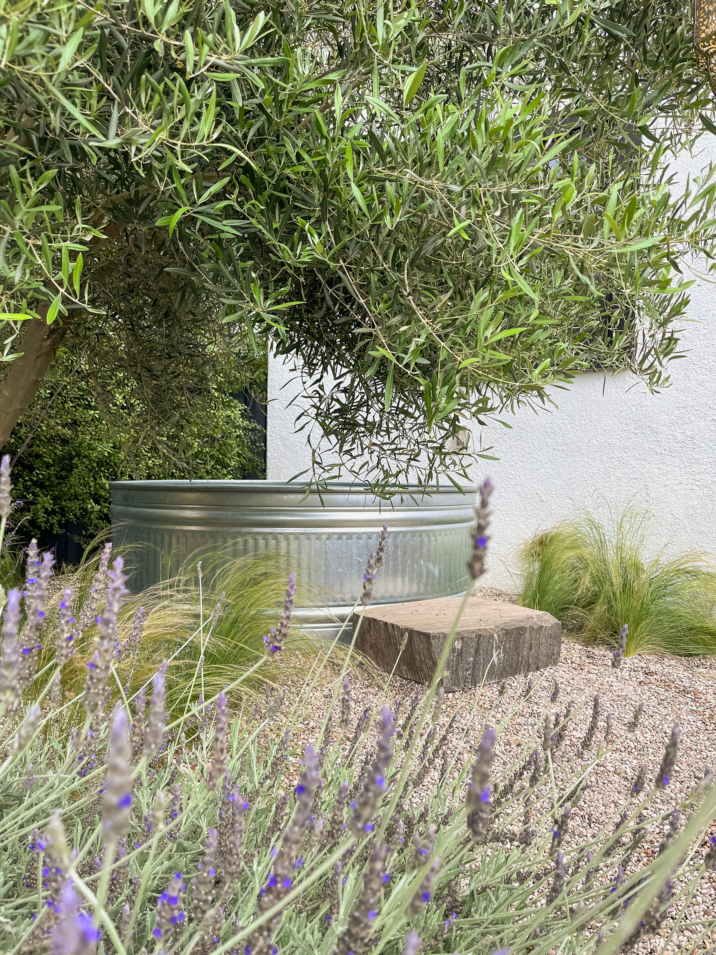 The backyard landscaping was inspired by Southern California’s ubiquitous kidney bean swimming pools, Luis Barragan’s pink walls, and a Mediterranean planting palette. The former sea of sod was transformed into a wildlife habitat with a mix of fruit trees and edible plants to create a bountiful and aromatic retreat. A pergola was added to create an outdoor dining area with a bougainvillea backdrop.
