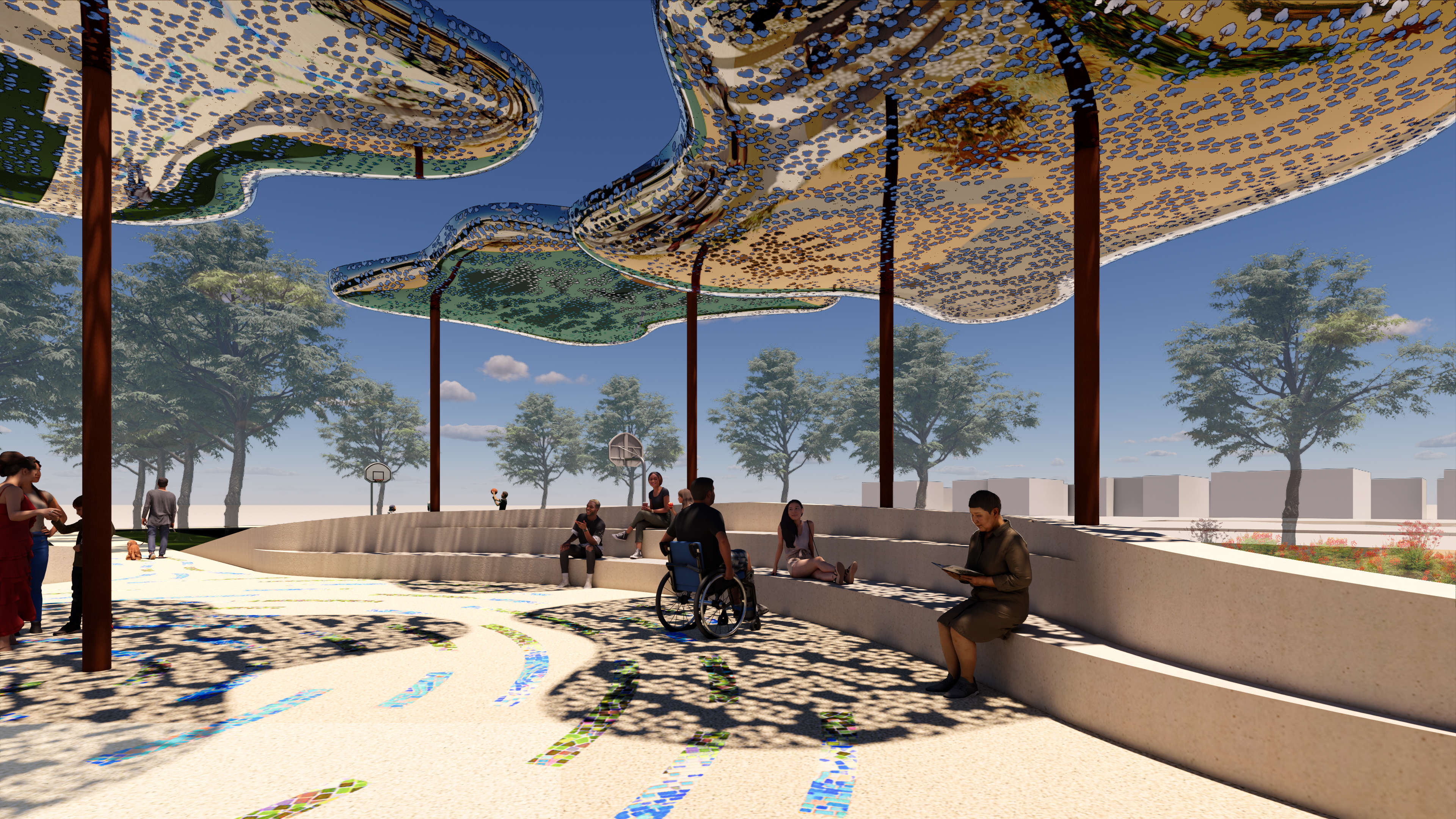 Mandy Palasik Studio and Artist James Dinh of Studiofolia have been selected to create Confluencia, a new community gathering space for the City of Surprise, Arizona. The proposed design is inspired by the meeting of two symbolic rivers—the past and the future—and celebrates the multigenerational community's spirit and history.
